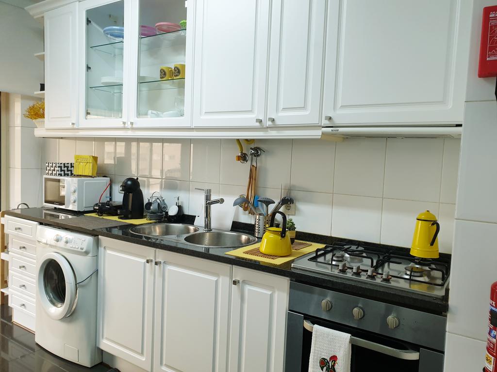Há micro-ondas, placa, forno, frigorífico, maquina de café, ferro de passar, secador de cabelo, aspirador de pó, o apto está totalmente equipado.